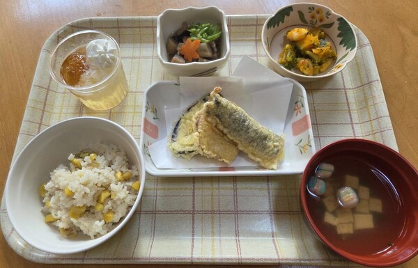 ・栗ご飯 ・季節の天ぷら(秋刀魚・さつまいも・秋茄子) ・筑前煮 ・海老とブロッコリーの南瓜サラダ ・吸い物 ・梨と紅茶のゼリーパフェ