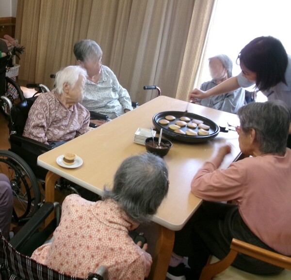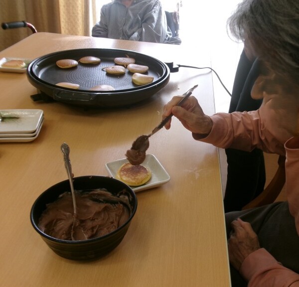 10月のおやつクラブはどら焼きを作りました。生地を焼く甘い匂いがフロアに広がると、皆様早く食べたいと話されていました。こしあんをはさむところはそれぞれ行っていただきました。また、初の試みとして、舌でつぶすことができる柔らかいどら焼きを作り、普段プリン等を召し上がっている方にもどら焼きを提供させていただきました。形があって美味しいと喜ばれていました。