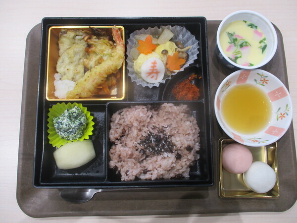 ・赤飯 ・漬物 ・天ぷら盛り合わせ(海老、茄子、栗のかき揚げ) ・炊き合わせ ・白和え ・フルーツ:梨 ・茶碗蒸し ・デザート:和菓子